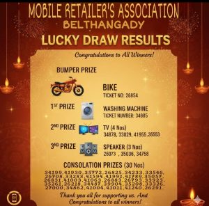 ಬೆಳ್ತಂಗಡಿ: ಬೆಳ್ತಂಗಡಿ ಮೊಬೈಲ್ ಅಸೋಸಿಯೇಶನ್ ಇದರ ವತಿಯಿಂದ ದೀಪಾವಳಿ ಹಬ್ಬದ ಪ್ರಯುಕ್ತ ತಾಲೂಕಿನ ವಿವಿಧ ಮೊಬೈಲ್ ಅಂಗಡಿಗಳಲ್ಲಿ ಗ್ರಾಹಕರಿಗೆ ವಿತರಿಸಲಾದ ಲಕ್ಕಿ ಕೂಪನ್ ಗಳ ಡ್ರಾ ಕಾರ್ಯಕ್ರಮ ಡಿ.01 ಸೋಮವಾರ ಬಸ್ ನಿಲ್ದಾಣದ ಬಳಿ ನಡೆಯಿತು. ಉದ್ಘಾಟನೆಯನ್ನು ಡಿವೈಎಸ್ಪಿ ರೋಹಿಣಿ ಸಿ.ಕೆ. ನೆರವೇರಿಸಿ ಮೊಬೈಲ್ ಸೇರಿದಂತೆ ಅನ್ ಲೈನ್ ವಂಚನೆ ಬಗ್ಗೆ ಜನರು ಎಚ್ಚರಿಕೆಯಿಂದ ಇರಬೇಕು, ಒಂದು ವೇಳೆ ಏನಾದರೂ ತೊಂದರೆಗೊಳಗಾದರೆ ತಡಮಾಡದೇ ತಕ್ಷಣ ಹೆಲ್ಪ್ ಲೈನ್ ನಂಬರ್ ಗೆ ಕರೆ ಮಾಡಿ ದೂರು ನೀಡಬೇಕು ಎಂದರು.